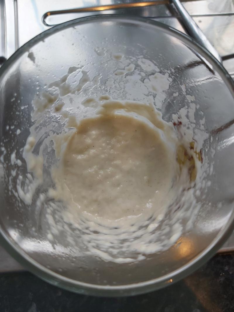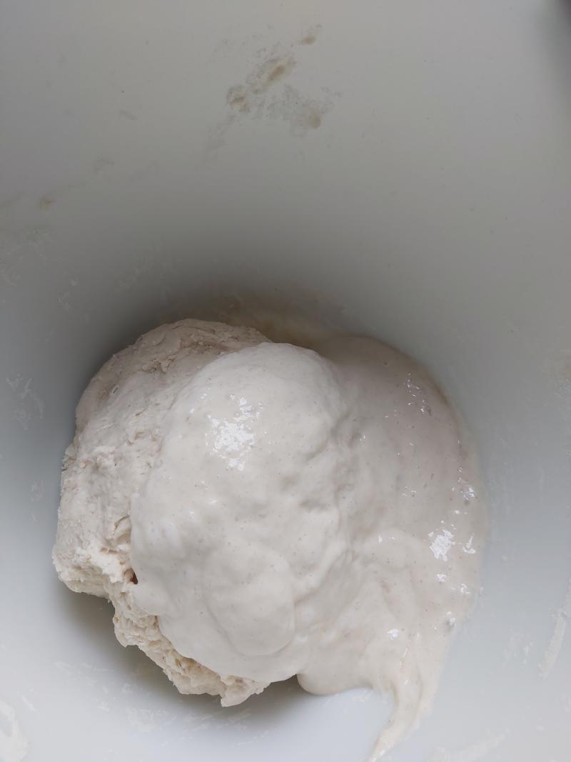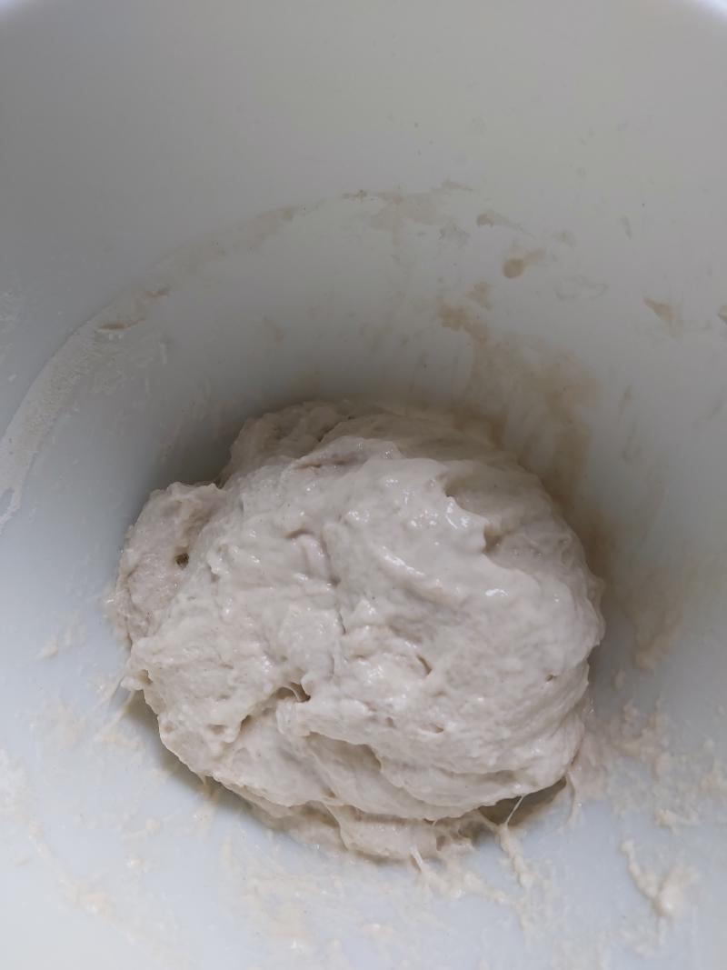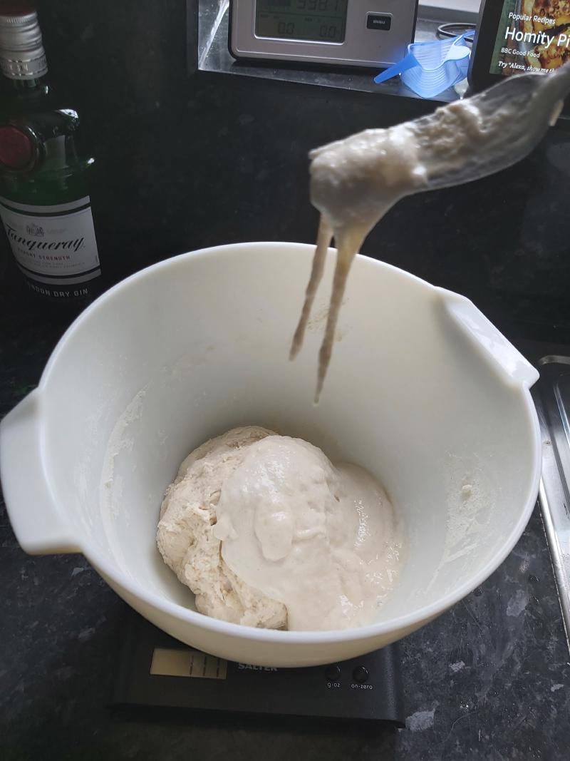 - Mix in 100g of starter to the mix and mix together until combined.