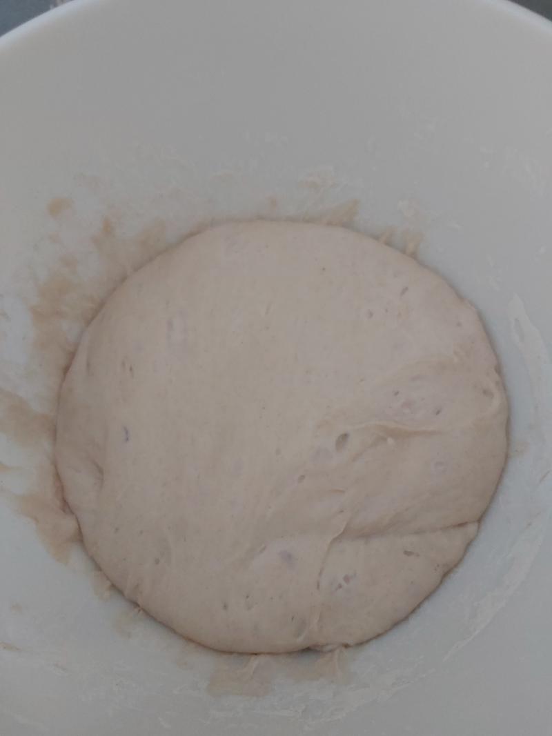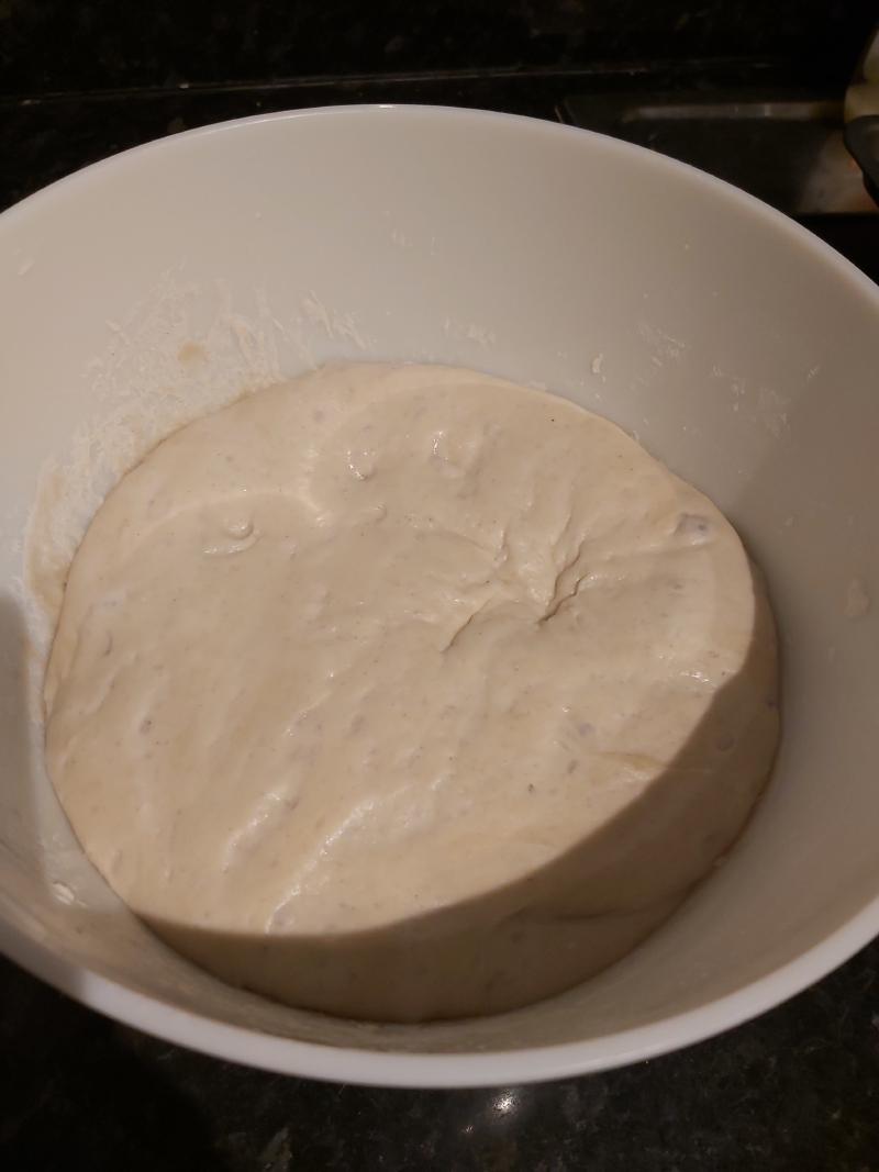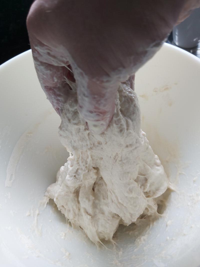 - Perform three “stretch and folds” at 30min intervals or when you remember. For each pull an edge of dough up and fold it back over itself, rotate the bowl 90 degrees and repeat round 6-10 times.