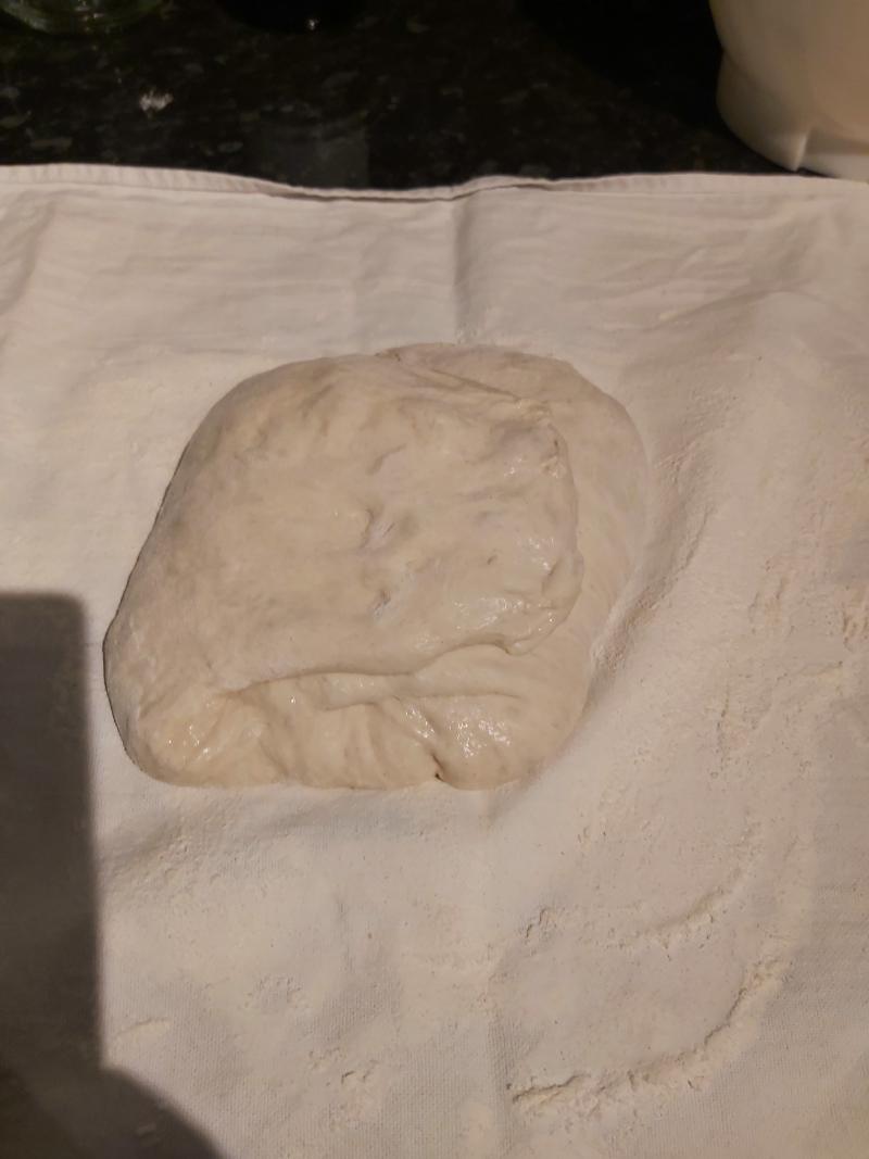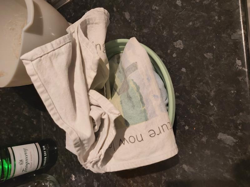 - Before going to bed lay out a tea towel, sprinkle with flour and put the dough on it. Then perform an “Envelope Fold”, pull a corner down and over the middle, then repeat on the opposite side after performing the same for the two other sides. Thus ending with a ball of dough covered in flour. Lift it up by the towel and place in a basket then place in the fridge.